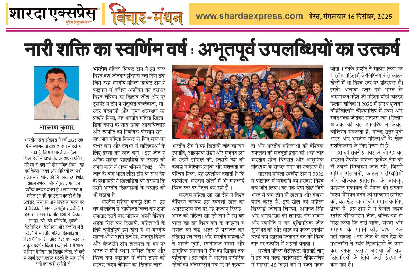 आकाश कुमार। भारतीय खेल इतिहास में वर्ष 2025 एक ऐसे स्वर्णिम अध्याय के रूप में दर्ज हो गया है, जिसमें भारतीय महिला खिलाड़ियों ने विश्व मंच पर अपनी प्रतिभा, परिश्रम से देश को गौरवान्वित किया। यह वर्ष केवल पदकों और ट्रॉफियों का नहीं, बल्कि नारी शक्ति की निर्णायक उपस्थिति, आत्मनिर्भरता और नेतृत्व क्षमता का प्रतीक बनकर उभरा है । खेल जगत में महिलाओं की यह उड़ान बताती है कि अवसर, संसाधन और विश्वास मिलने पर वे वैश्विक शिखर तक पहुँच सकती हैं ।