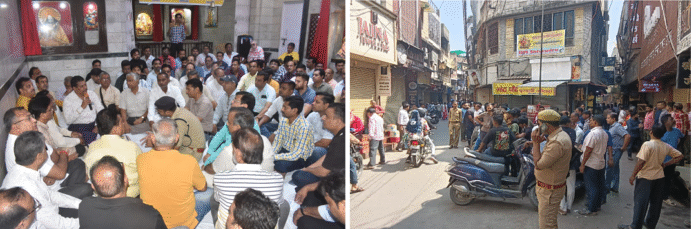 उन्होंने कहा कि अगर जरूरत पड़ी तो सराफा कारोबारी आगे भी अपने प्रतिष्ठानों को बंद करके अन्य बाजारों को भी बंद करवा देंगे। बैठक में संयुक्त व्यापार संघ के अध्यक्ष नवीन गुप्ता एवं उनकी टीम के पदाधिकारी भी रहे। नील की गली सराफा एसोसिएशन के अध्यक्ष लोकेश अग्रवाल, कागजी बाजार व्यापार संघ के अध्यक्ष गुलशन पाहवा, सदर बाजार सराफा एसोसिएशन के अध्यक्ष शम्मी सपरा, शहर सर्राफा बाजार एसोसिएशन के महामंत्री नरेश माहेश्वरी , संदीप अग्रवाल, मनोज गर्ग, कोमल वर्मा, बलराम जौहरी, अक्षत जैन, रोहित जैन, अनिल शारदा, दीपक जौहरी, अमित अग्रवाल, दीपक कंसल, अनुराग अग्रवाल, विकास रस्तोगी, संत कुमार वर्मा, मनोज मंडल, मवकील खान मौजूद रहे।