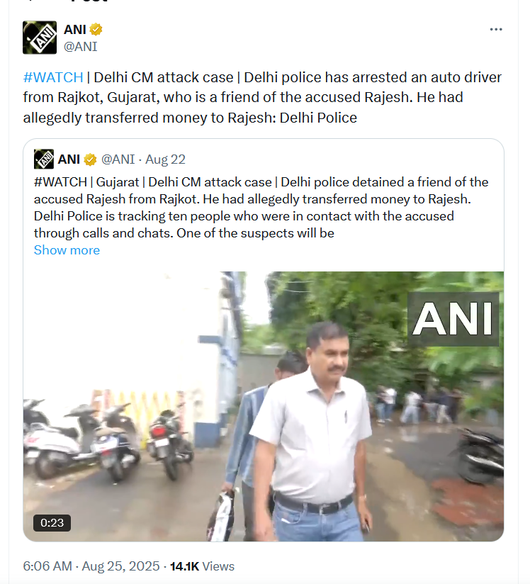 पैसों और वीडियो का हुआ था लेन-देन: जांच में पता चला है कि खिमजी ने मुख्यमंत्री रेखा गुप्ता के शालीमार बाग स्थित घर का एक वीडियो तहसीन को भेजा था। इसके बदले तहसीन ने उसे 2,000 रुपये दिए थे। पुलिस का कहना है कि मुख्यमंत्री पर हमले से ठीक पहले दोनों लगातार संपर्क में थे. बुधवार को जब मुख्यमंत्री रेखा गुप्ता अपने सिविल लाइंस स्थित कैंप कार्यालय में ‘जन सुनवाई’ कर रही थीं, तभी उन पर हमला हुआ।