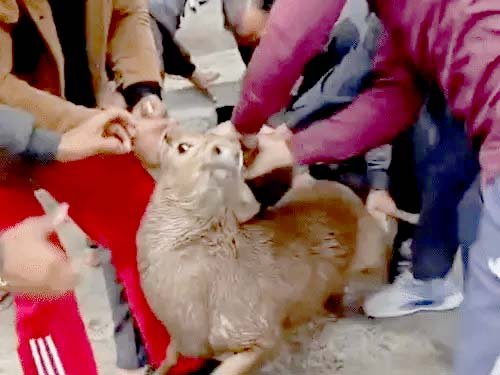 आवारा कुत्तों से बचकर आबादी के बीच पहुंचा हिरण