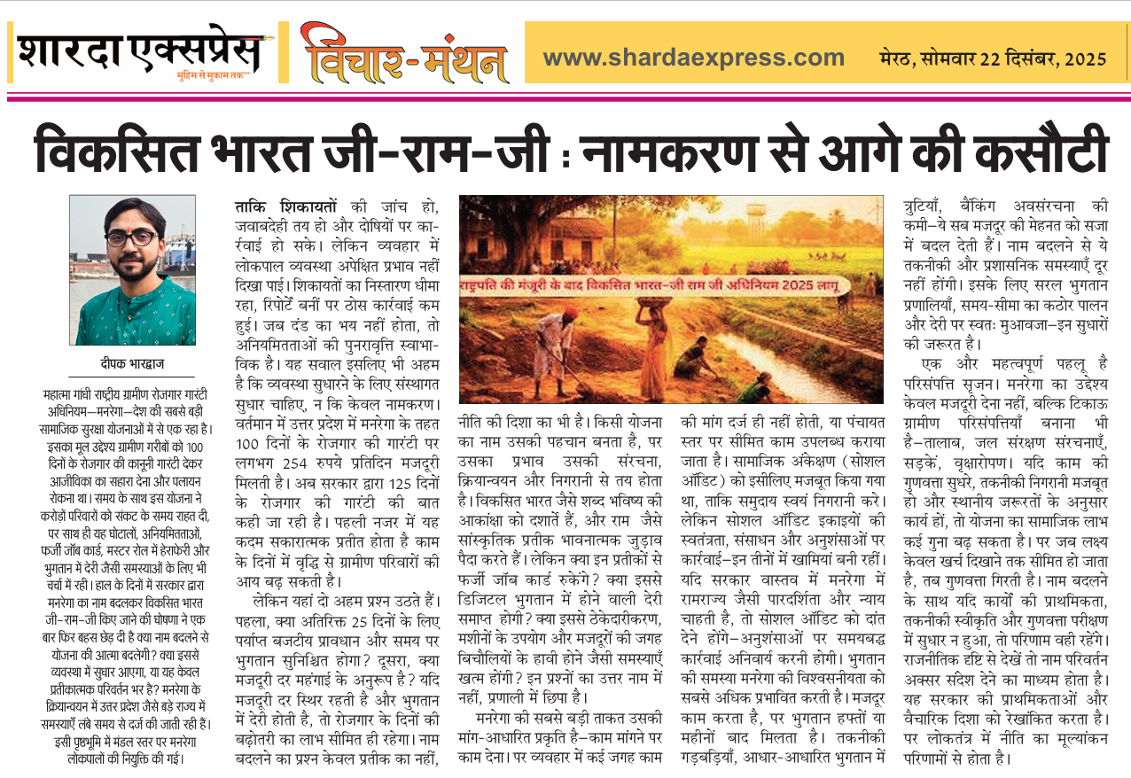 दीपक भारद्वाज | महात्मा गांधी राष्ट्रीय ग्रामीण रोजगार गारंटी अधिनियम—मनरेगा—देश की सबसे बड़ी सामाजिक सुरक्षा योजनाओं में से एक रहा है। इसका मूल उद्देश्य ग्रामीण गरीबों को 100 दिनों के रोजगार की कानूनी गारंटी देकर आजीविका का सहारा देना और पलायन रोकना था। समय के साथ इस योजना ने करोड़ों परिवारों को संकट के समय राहत दी, पर साथ ही यह घोटालों, अनियमितताओं, फर्जी जॉब कार्ड, मस्टर रोल में हेराफेरी और भुगतान में देरी जैसी समस्याओं के लिए भी चर्चा में रही। हाल के दिनों में सरकार द्वारा मनरेगा का नाम बदलकर विकसित भारत जी-राम-जी किए जाने की घोषणा ने एक बार फिर बहस छेड़ दी है क्या नाम बदलने से योजना की आत्मा बदलेगी? क्या इससे व्यवस्था में सुधार आएगा, या यह केवल प्रतीकात्मक परिवर्तन भर है? मनरेगा के क्रियान्वयन में उत्तर प्रदेश जैसे बड़े राज्य में समस्याएँ लंबे समय से दर्ज की जाती रही हैं। इसी पृष्ठभूमि में मंडल स्तर पर मनरेगा लोकपालों की नियुक्ति की गई।