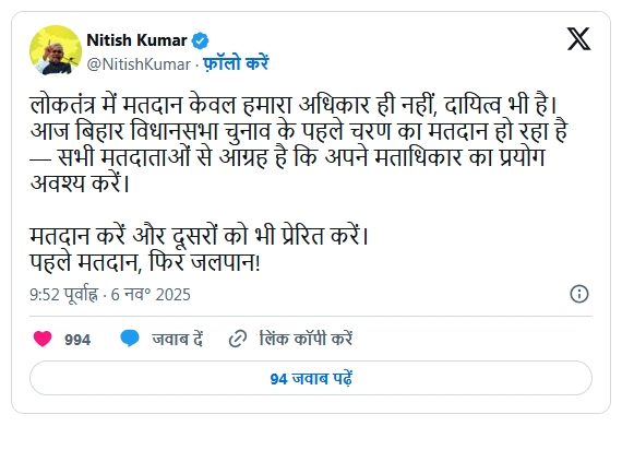 नीतीश ने सोशल मीडिया पोस्ट में कहा, “लोकतंत्र में मतदान केवल हमारा अधिकार ही नहीं, दायित्व भी है. आज बिहार विधानसभा चुनाव के पहले चरण का मतदान हो रहा है. सभी मतदाताओं से आग्रह है कि अपने मताधिकार का प्रयोग अवश्य करें. मतदान करें और दूसरों को भी प्रेरित करें. पहले मतदान, फिर जलपान!”