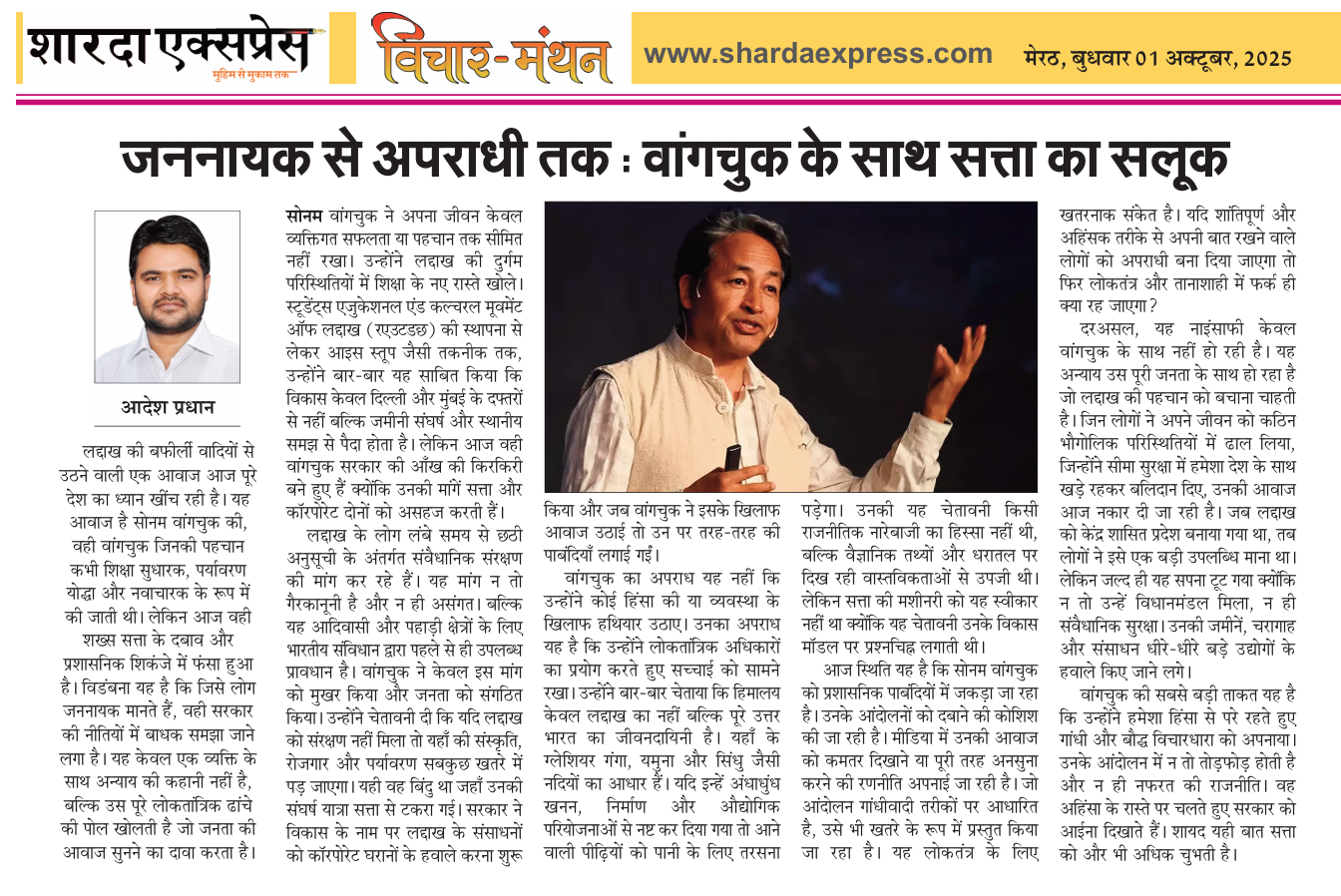 आदेश प्रधान, एडवोकेट। लद्दाख की बर्फीली वादियों से उठने वाली एक आवाज़ आज पूरे देश का ध्यान खींच रही है। यह आवाज़ है सोनम वांगचुक की, वही वांगचुक जिनकी पहचान कभी शिक्षा सुधारक, पर्यावरण योद्धा और नवाचारक के रूप में की जाती थी। लेकिन आज वही शख्स सत्ता के दबाव और प्रशासनिक शिकंजे में फंसा हुआ है। विडंबना यह है कि जिसे लोग जननायक मानते हैं, वही सरकार की नीतियों में बाधक समझा जाने लगा है। यह केवल एक व्यक्ति के साथ अन्याय की कहानी नहीं है, बल्कि उस पूरे लोकतांत्रिक ढांचे की पोल खोलती है जो जनता की आवाज़ सुनने का दावा करता है।