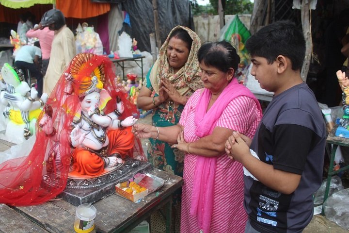 जीआईसी इंटर कॉलेज के पास गणपति स्थापना के लिए गणपति बप्पा की पूजा करते लोग।