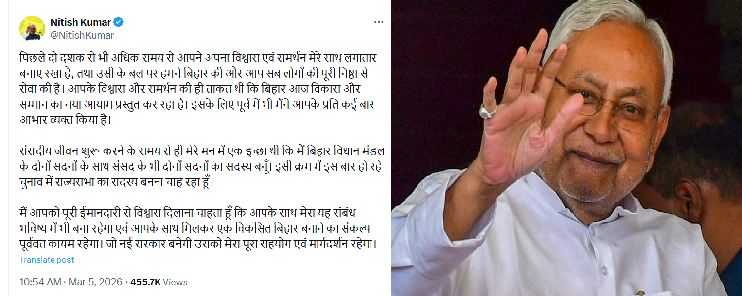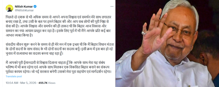 गुरुवार (05 मार्च, 2026) को सीएम ने सोशल मीडिया मंच एक्स (X) हैंडल से इस संबंध में पोस्ट किया। उन्होंने कहा कि “पिछले दो दशक से भी अधिक समय से आपने अपना विश्वास एवं समर्थन मेरे साथ लगातार बनाए रखा है, तथा उसी के बल पर हमने बिहार की और आप सब लोगों की पूरी निष्ठा से सेवा की है। आपके विश्वास और समर्थन की ही ताकत थी कि बिहार आज विकास और सम्मान का नया आयाम प्रस्तुत कर रहा है। इसके लिए पूर्व में भी मैंने आपके प्रति कई बार आभार व्यक्त किया है।”