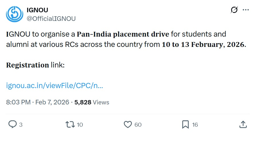इग्नू की ओर से दी गई जानकारी के मुताबिक इस प्लेसमेंट अभियान में फिनटेक, IT और BPO सेक्टर की कई प्रमुख कंपनियां युवाओं को जॉब ऑफर प्रदान करेंगी।