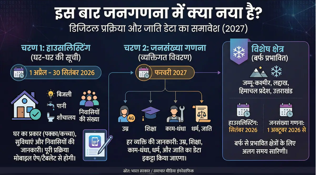 नई दिल्ली: जनगणना के पहले चरण की अधिसूचना जारी हो गई है। पहला चरण 1 अप्रैल से 30 सितंबर 2026 के बीच सभी राज्यों और केंद्र शासित प्रदेशों में हो जाएगा। यह पहली बार डिजिटल रूप में होगा। कैसे होगी पूरी प्रक्रिया? डिजिटल जनगणना का अर्थ। जाति गणना का मकसद क्या है?