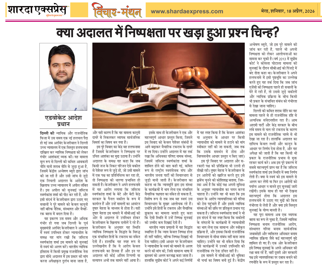 एडवोकेट आदेश प्रधान | दिल्ली की न्यायिक और राजनीतिक फिज़ा में उस समय एक नई हलचल पैदा हो गई जब अरविंद केजरीवाल ने दिल्ली उच्च न्यायालय में एक विस्तृत हलफनामा दाखिल कर न्यायिक निष्पक्षता को लेकर गंभीर आशंकाएं व्यक्त कीं। यह मामला मूल रूप से दिल्ली की कथित आबकारी नीति यानी शराब नीति से जुड़ा हुआ है, जिसमें केंद्रीय अन्वेषण ब्यूरो द्वारा जांच की जा रही है और उसी जांच से जुड़े एक निचली अदालत के आदेश के खिलाफ उच्च न्यायालय में अपील लंबित है। इस अपील की सुनवाई जस्टिस स्वर्णकांता शर्मा की पीठ कर रही है, और इसी संदर्भ में केजरीवाल द्वारा उठाए गए सवालों ने पूरे मामले को केवल कानूनी नहीं बल्कि नैतिक, संस्थागत और वैचारिक बहस में बदल दिया है।