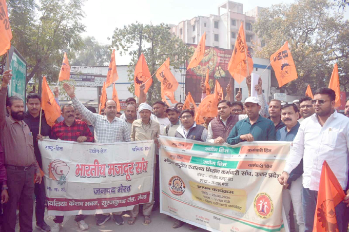 शारदा रिपोर्टर मेरठ। बुधवार को भारतीय मजदूर संघ की केन्द्रीय कार्य समिति के आहवान पर जनपद मेरठ के पदाधिकारी एवं कार्यकर्ता, जिलाध्यक्ष विनय शर्मा के नेतृत्व में झंडे बैनर के साथ नारे बाजी करते हुए चौधरी चरण सिंह पार्क में इकटठा हुए। इस दौरान जिला अध्यक्ष विनय शर्मा ने बताया विगत 6-7 एवं 8 फरवरी को जगन्नाथपुरी में अखिल भारतीय राष्ट्रीय अधिवेशन सम्पन्न हुआ। जिसमें श्रमिकों की समस्यओं पर विस्तार में चिंता व्यक्त की गई। उसी क्रम में 25 फरवरी को श्रमिकों की विभिन्न समस्याओं को लेकर जिलाधिकारी के माध्यम से देश के प्रधानमंत्री नरेन्द्र मोदी, श्रम मंत्री तथा उत्तर प्रदेश के मुख्यमंत्री योगी आदित्यनाथ को राष्ट्रव्यापी प्रदर्शन के तहत ज्ञापन प्रस्तुत किया जा रहा है।