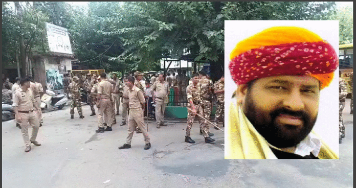 पुलिस अधिकारियों ने दी जानकारी, कमिश्नरी चौराहे पर भारी पुलिसबल तैनात, मुखिया गुर्जर की गिरफ्तारी के बाद बेटे ने समर्थकों से की कलेक्ट्रेट पहुंचने की अपील, सोशल मीडिया एकाउंट से की अपील, एहतियात के तौर पर फोर्स की गई तैनात।