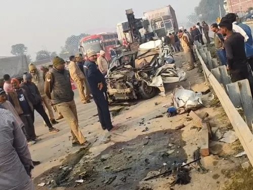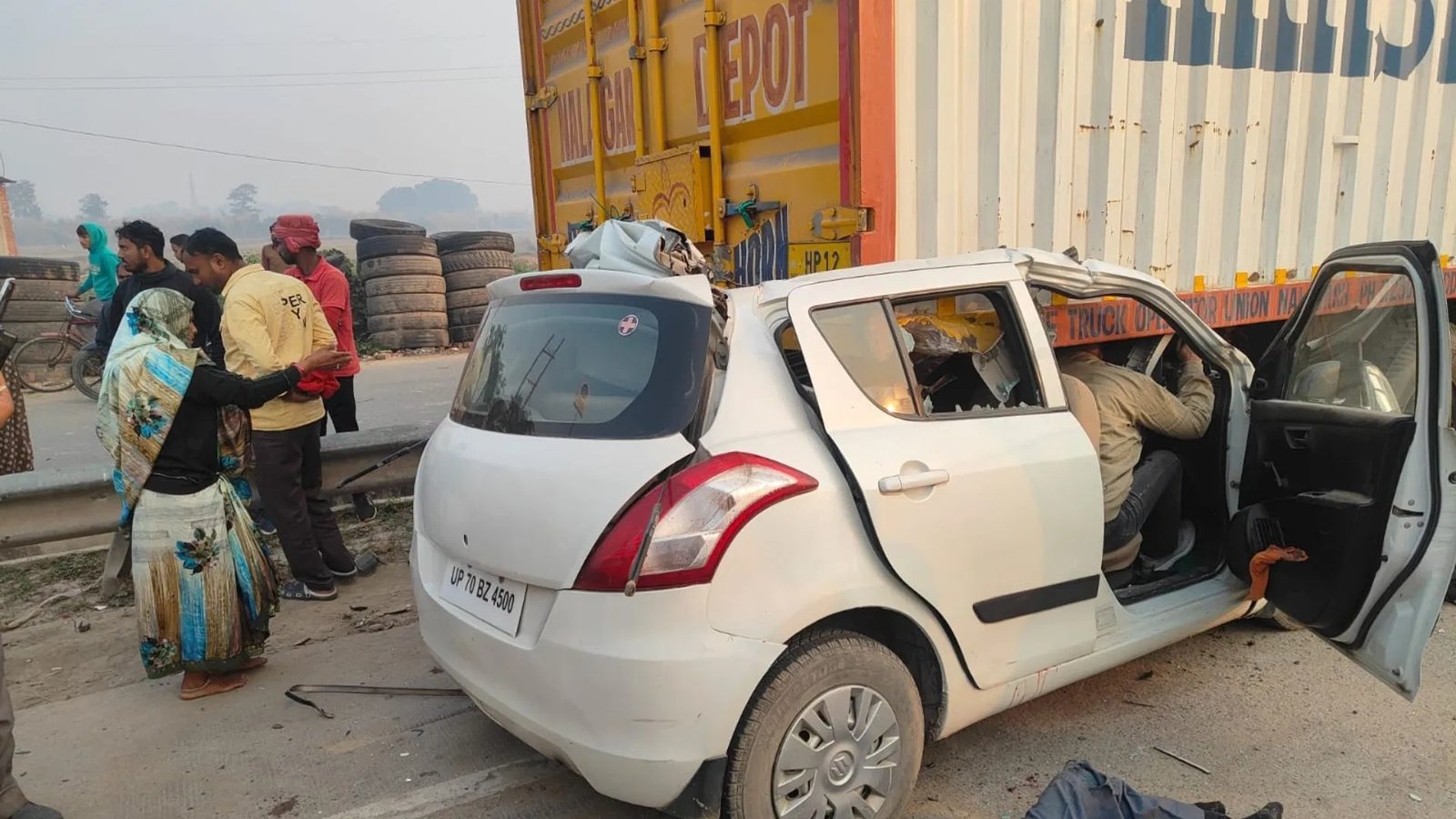 – कार दो लोगों को रौंदते हुए हाईवे पर खड़े ट्रक में घुसी, प्रयागराज से काशी जा रहे थे।