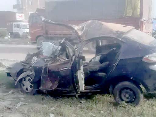 सोमवार सुबह मूंढापांडे क्षेत्र के मनकरा मोड़ के पासतेज रफ्तार कार आगे चल रही ईंटों से भरी ट्रैक्टर-ट्रॉली में घुस गई। टक्कर इतनी जोरदार थी कि कार के परखच्चे उड़ गए। पुलिस ने कड़ी मशक्कत के बाद कार में फंसे लोगों को बाहर निकाला। इसके बाद मूंढापांडे सीएचसी पहुंचाया गया। जहां डाक्टरों ने कार सवार पांच युवकों में से चार को मृत घोषित कर दिया।