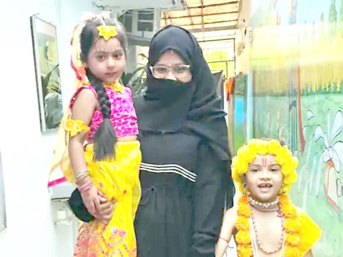 मेरठ (वि)। अमेरिकन किड्स साकेत में आपसी भाईचारे की अद्भुत मिसाल सामने आई। स्कूल की कॉर्डिनेटर जैनब सैफी ने आज जन्माष्टमी सेलिब्रेशन को लीड किया। सभी बच्चों को श्री कृष्ण एवं राधिका के पूर्ण स्वरूप दिया। उनके द्वारा सज्जित बच्चों में वास्तविकता के प्रभु दिखाई दे रहे थे। वहीं दूसरी ओर सीनियर केजी की क्लास टीचर कैरेन थॉमस जो कि एक ईसाई परिवार से हैं वो स्वयं राधिका के रूप में स्कूल आई और नाटिका के राधिका का किरदार निभाया।