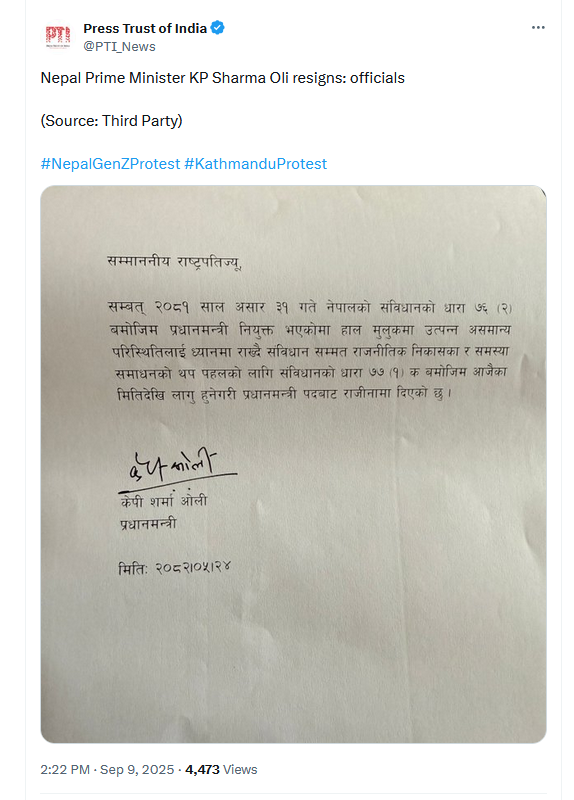 नेपाल के प्रधानमंत्री केपी शर्मा ने पद से इस्तीफा दे दिया है