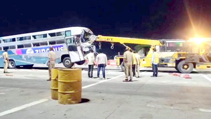 पुलिस अधिकारियों के मुताबिक निजी डबल डेकर बस औरया के बिधूना से दिल्ली जा रही थी। देर रात बस जेवर टोल के पास बस का संतुलन बिगड़ गया। तेज रफ्तार बस आगे जा रहे आम से भरे कैंटर से टकरा गई। आम लदा कैंटर दिल्ली मंडी आपूर्ति के लिए जा रहा था। हादसे में चालक और परिचालक समेत बस में सवार 15 बस यात्री गंभीर रूप से घायल हो गए। इसके बाद बस असंतुलित होकर दाहिनी लेन में टोल के लिए खड़ी कार में टकरा गई। बस की टक्कर से एक के बाद एक पांच कारें आपस में टकराती चली गईं।