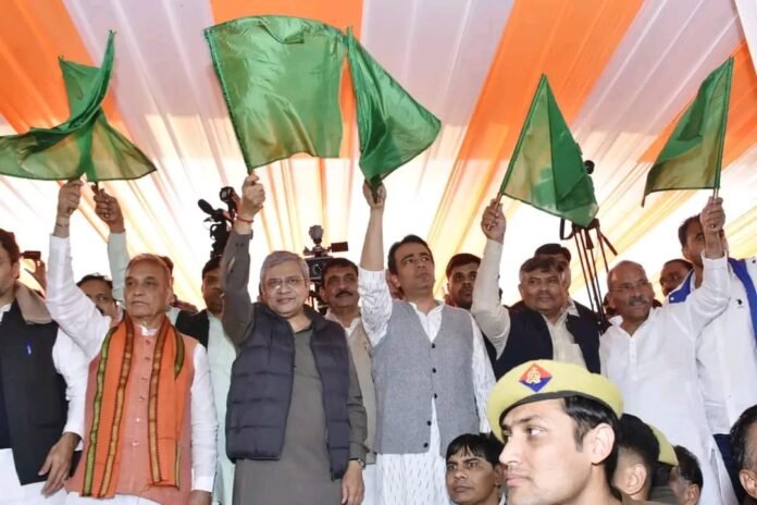 बड़ौत (बागपत)। बड़ौत रेलवे स्टेशन पर सोमवार को दिल्ली–शामली रूट पर दो नई रेलगाड़ियों का शुभारंभ केंद्रीय राज्य मंत्री (स्वतंत्र प्रभार) चौधरी जयंत सिंह और रेल मंत्री अश्वनी वैष्णव ने संयुक्त रूप से किया। कार्यक्रम में भारी जनसमूह की उपस्थिति रही।