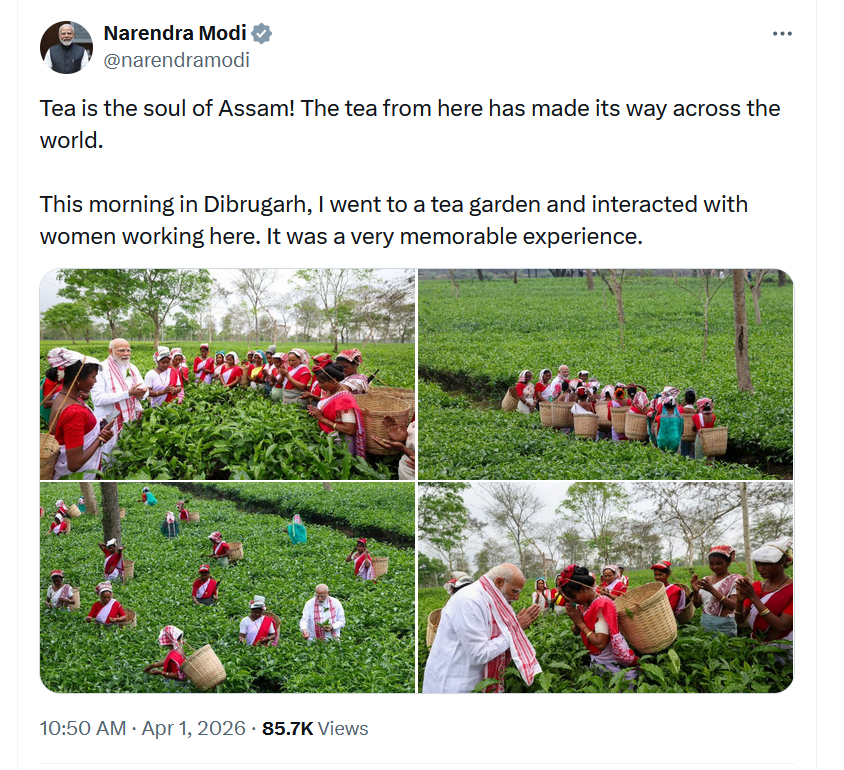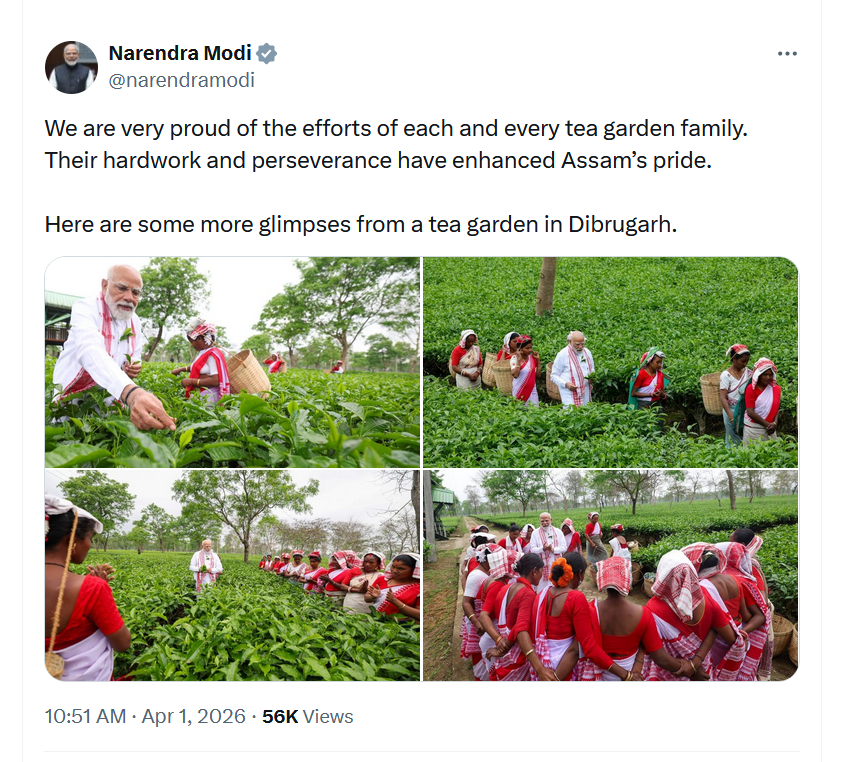 पीएम मोदी ने डिब्रूगढ़ के चाय बगान की कुछ तस्वीरें शेयर करते हुए लिखा कि चाय असम की आत्मा है। यहां की चाय ने पूरी दुनिया में अपनी पहचान बनाई है। आज सुबह डिब्रूगढ़ में, मैं एक चाय के बगान में गया और वहां काम करने वाली महिलाओं से बातचीत की। यह मेरे लिए एक बहुत ही यादगार अनुभव था।