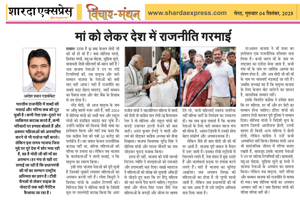 आदेश प्रधान एडवोकेट | भारतीय राजनीति में शब्दों की मर्यादा और गरिमा कब की टूट चुकी है। कभी नेता एक-दूसरे पर व्यक्तिगत कटाक्ष करते हैं, कभी परिवारों पर हमला बोलते हैं और अक्सर महिलाओं को अपमानित करने से भी परहेज़ नहीं करते। लेकिन इस समय भाजपा जिस मुद्दे पर पूरे देश में शोर मचा रही है, वह है – “मोदी जी की माँ का अपमान।” हर मंच से यही रट लगाई जा रही है कि प्रधानमंत्री की माँ का सम्मान राष्ट्रीय अस्मिता का प्रश्न है। टीवी चैनलों से लेकर सड़क के पोस्टरों तक यही नैरेटिव फैलाया जा रहा है।