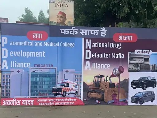 इलाहाबाद विश्वविद्यालय के पूर्व छात्र संघ अध्यक्ष अवनीश यादव की तरफ से लगाए गए पोस्टर में सपा के पीडीए को पैरामेडिकल और मेडिकल डेवेलपमेंट एलाइंज लिखकर अस्पताल, मेडिकल कॉलेज और एंबुलेंस की तस्वीरें लगाई गई हैं। भाजपा के एनडीए को नेशनल ड्रग डिफाल्टर माफिया एलाइंज लिखा गया है, जहां बुलडोजर, लग्जरी कारें और एक कथित काली कमाई वाला बोर्ड दिखाकर सत्तारूढ़ दल पर माफिया और काले धन को बढ़ावा देने के आरोप लगाए गए हैं। इसे पूर्वांचल के नेता पर व्यंग्य के रूप में दिखाया गया है।