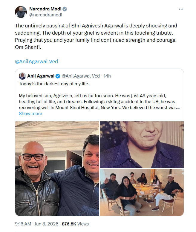 प्रधानमंत्री मोदी ने वेंदाता ग्रुप के चेयरमैन अनिल अग्रवाल के बेटे अग्निवेश अग्रवाल के निधन पर शोक व्यक्त किया है। गौरतलब है कि अग्निवेश का कार्डिएक अरेस्ट के कारण निधन हो गया था। पीएम मोदी ने एक्स पर पोस्ट कर लिखा कि अग्निवेश के अचानक हुए निधन से दुखी हूं। पीएम मोदी ने कहा कि अग्निवेश अग्रवाल का असामयिक निधन अत्यंत स्तब्ध और दुखद है। आपकी श्रद्धांजलि में आपके गहरे शोक का भाव साफ दिख रहा है। इस दुख की घड़ी में आपको और आपके परिवार को निरंतर शक्ति और साहस मिले। ओम शांति।