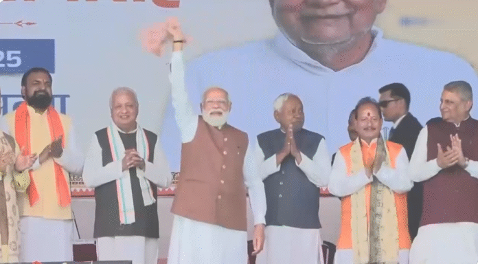समारोह के आखिरी में नीतीश कुमार फिर से पीएम मोदी की ओर बढ़े। उन्होंने पीएम मोदी का हाथ पकड़ते हुए उसे ऊपर उठाया और केंद्र और राज्य में ये जुगलबंदी आगे भी जारी रहने का संकेत दिया। पीएम मोदी ने जनता का अभिवादन स्वीकार करते हुए सिर झुकाया और विनम्रता से उन्हें प्रणाम किया।