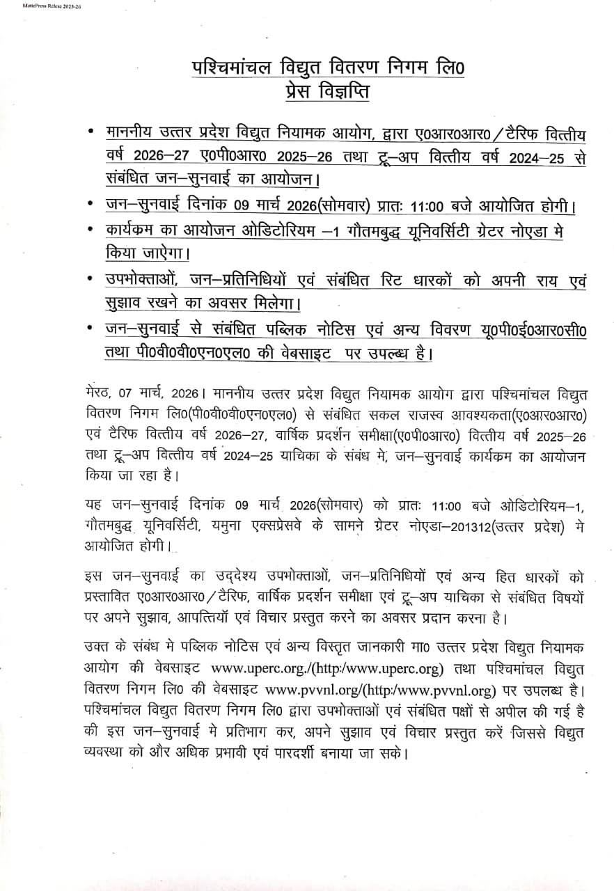 मेरठ। उत्तर प्रदेश विद्युत नियामक आयोग द्वारा पश्चिमांचल विद्युत वितरण निगम लि० (पी०वी०वी०एन०एल०) से संबंधित सकल राजस्व आवश्यकता (ए०आर०आर०) एवं टैरिफ वित्तीय वर्ष 2026-27, वार्षिक प्रदर्शन समीक्षा (ए०पी०आर०) वित्तीय वर्ष 2025-26 तथा टू-अप वित्तीय वर्ष 2024-25 याचिका के संबंध मे, जन सुनवाई कार्यक्रम का आयोजन किया जा रहा है।