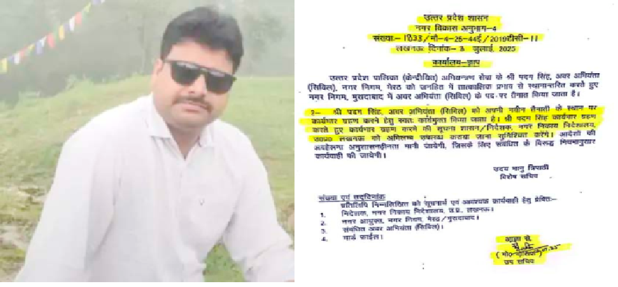 शारदा रिपोर्टर मेरठ। नगर निगम में तबादला आदेशों की अनदेखी और नियमों का उल्लंघन चरम पर है। सच संस्था के अध्यक्ष संदीप पहल ने यह आरोप लगाया है। इसका कारण है कि निगम में निर्माण विभाग के खए पदम सिंह का तबादला शासन की ओर से 3 जुलाई 2025 को मुरादाबाद किया जा चुका है। आदेश में स्पष्ट रूप से लिखा गया था कि उन्हें वर्तमान तैनाती से तत्काल कार्यमुक्त कर नई तैनाती स्थल पर कार्यभार ग्रहण करना है। इसके बावजूद नगर निगम ने उन्हें न तो रिलीव किया और न ही ट्रांसफर आदेश का पालन किया।