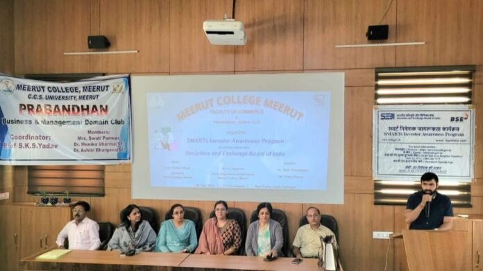 शारदा रिपोर्टर मेरठ। मेरठ कॉलेज के वाणिज्य संकाय एवं प्रबंधन डोमेन क्लब द्वारा भारतीय प्रतिभूति और विनिमय बोर्ड के सहयोग से स्मार्ट निवेशक जागरूकता कार्यक्रम का भव्य आयोजन किया गया। इस ज्ञानवर्धक कार्यक्रम का उद्देश्य विद्यार्थियों को वित्तीय नियोजन, साइबर सुरक्षा, सुरक्षित निवेश तथा निवेश से जुड़े उनके अधिकारों के प्रति जागरूक करना था। कार्यक्रम का शुभारंभ मां सरस्वती का माल्यार्पण एवं दीप प्रज्वलन के साथ हुआ, जिससे वातावरण में सकारात्मक ऊर्जा और विद्या का संचार हुआ। मंच संचालन का उत्तरदायित्व डॉ. विनय आर्य ने अत्यंत प्रभावशाली ढंग से निभाया।