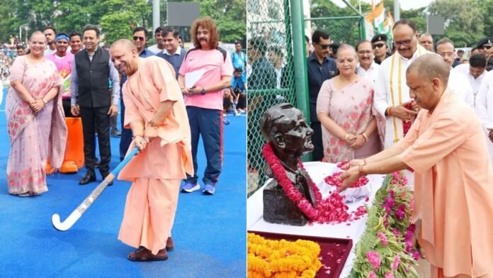 लखनऊ : मुख्यमंत्री योगी आदित्यनाथ ने शुक्रवार को हॉकी के जादूगर मेजर ध्यान चंद के जन्म दिवस पर उनको नमन करने के साथ हॉकी के जादूगर के प्रति अपने प्रेम को भी दशार्या। उन्होंने पद्मश्री मोहम्मद शाहिद स्टेडियम के एस्ट्रोटर्फ ग्राउंड पर हॉकी पर हाथ आजमाने के साथ अंतरराष्ट्रीय और राष्ट्रीय स्तर पर प्रदेश को गौरवांवित करने वाले 88 खिलाड़ियों को पुरस्कृत किया। मुख्यमंत्री ने पूर्व ओलंपियन को भी सम्मानित किया।