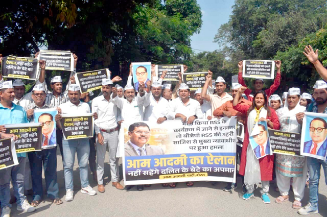 शारदा रिपोर्टर मेरठ। शुक्रवार को आम आदमी पार्टी प्रदेश प्रवक्ता और मेरठ जिलाध्यक्ष अंकुश चौधरी के नेतृत्व में आम आदमी पार्टी के कार्यकर्ताओं ने प्रदर्शन किया। इस दौरान उन्होंने मुख्य न्यायधीश पर जूता फेंकने वाले पर सख्त कार्रवाई की मांग की।