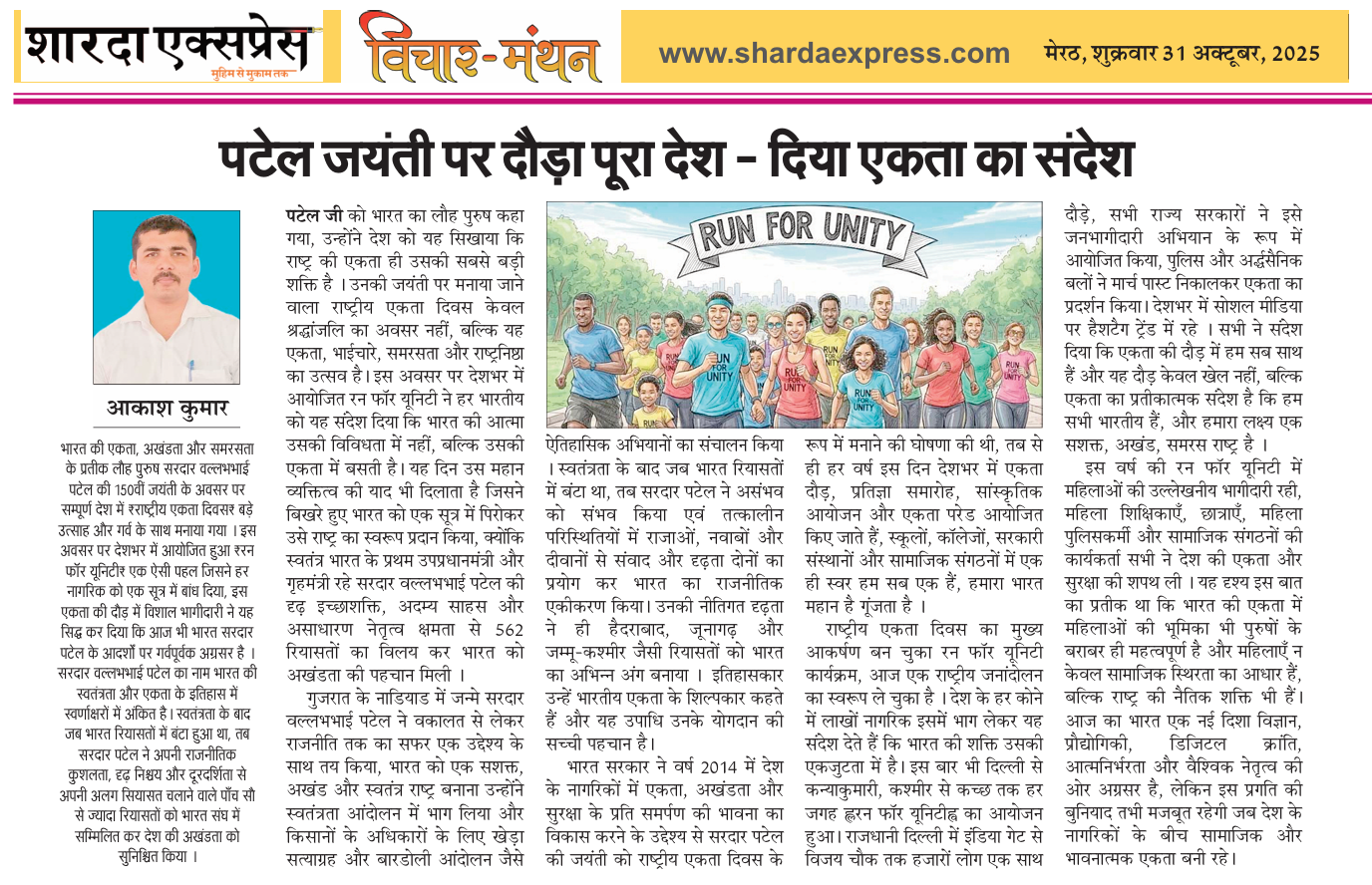 आकाश कुमार, मेरठ। भारत की एकता, अखंडता और समरसता के प्रतीक लौह पुरुष सरदार वल्लभभाई पटेल की 150वीं जयंती के अवसर पर सम्पूर्ण देश में “राष्ट्रीय एकता दिवस” बड़े उत्साह और गर्व के साथ मनाया गया । इस अवसर पर देशभर में आयोजित हुआ “रन फॉर यूनिटी” एक ऐसी पहल जिसने हर नागरिक को एक सूत्र में बांध दिया, इस एकता की दौड़ में विशाल भागीदारी ने यह सिद्ध कर दिया कि आज भी भारत सरदार पटेल के आदर्शों पर गर्वपूर्वक अग्रसर है ।