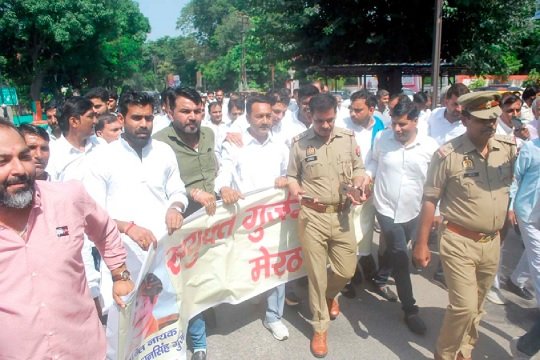 शारदा रिपोर्टर मेरठ। शुक्रवार को गुर्जर समाज के लोगों ने कमिश्नरी चौराहे पर प्रदर्शन किया। इस दौरान उन्होंने एक ज्ञापन कमिश्नर कार्यालय पर सौंपते हुए बताया कि, अब गुर्जर समाज में भाजपा सरकार के प्रति जबरदस्त आक्रोश पनप रहा है।