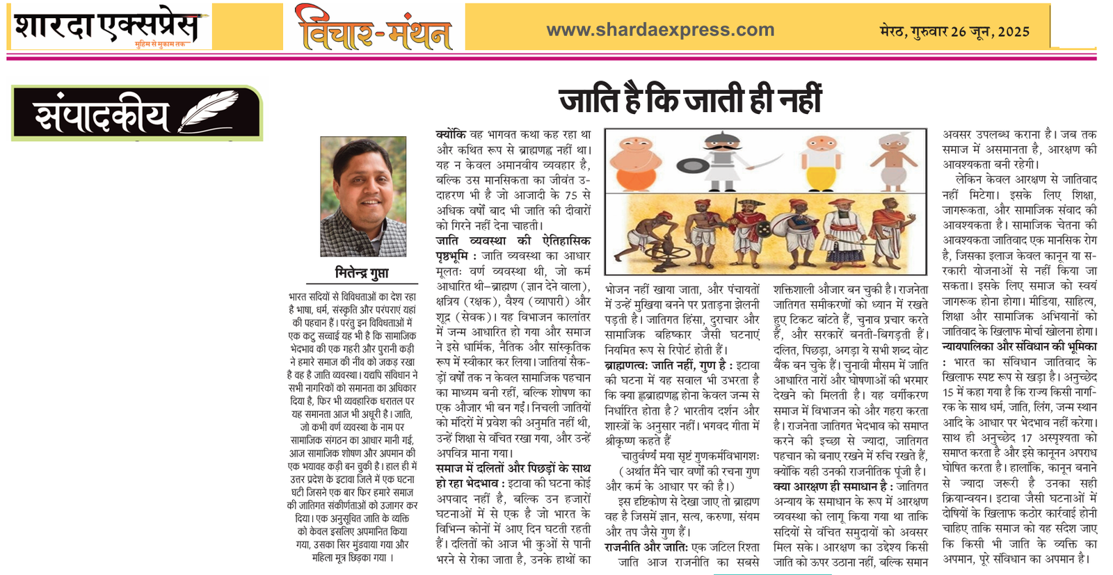 मितेन्द्र गुप्ता | भारत सदियों से विविधताओं का देश रहा है भाषा, धर्म, संस्कृति और परंपराएं यहां की पहचान हैं। परंतु इन विविधताओं में एक कटु सच्चाई यह भी है कि सामाजिक भेदभाव की एक गहरी और पुरानी कड़ी ने हमारे समाज की नींव को जकड़ रखा है वह है जाति व्यवस्था। यद्यपि संविधान ने सभी नागरिकों को समानता का अधिकार दिया है, फिर भी व्यवहारिक धरातल पर यह समानता आज भी अधूरी है। जाति, जो कभी वर्ण व्यवस्था के नाम पर सामाजिक संगठन का आधार मानी गई, आज सामाजिक शोषण और अपमान की एक भयावह कड़ी बन चुकी है। हाल ही में उत्तर प्रदेश के इटावा जिले में एक घटना घटी जिसने एक बार फिर हमारे समाज की जातिगत संकीर्णताओं को उजागर कर दिया। एक अनुसूचित जाति के व्यक्ति को केवल इसलिए अपमानित किया गया, उसका सिर मुंडवाया गया और महिला मूत्र छिड़का गया।