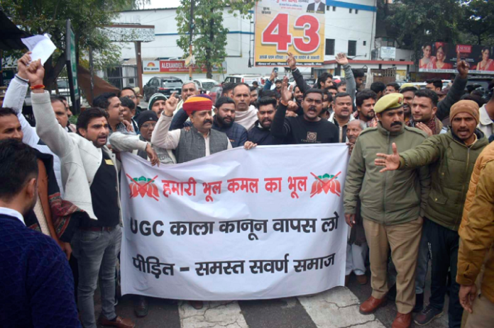 शारदा रिपोर्टर मेरठ। बैनर पर लिखे ‘हमारी भूल कमल का फूल’ को लेकर बुधवार को स्वर्ण समाज के दर्जनों लोगों ने कमिश्नरी चौराहे पर प्रदर्शन किया। इस दौरान उन्होंने बताया कि, यूजीसी को तत्काल प्रभाव से वापिस लिया जाए। उन्होंने कहा कि यूजीसी की नई अधिसूचना उच्च शिक्षा संस्थानों में जाति-धारित भेदभाव को रोकने के उद्देश्य से लाया जाना बताया गया है। लेकिन यह अधिसूचना पूरी तरह एससी-एसटी एवं ओबीसी वर्ग के के अधिकारों पर केंद्रित है, जबकि सामान्य वर्ग के छात्र के सिद्धांत को कमजोर कर यह अधिसूचना एकतरफा दिखाई दे रही है। जो कि एक वर्ग के अधिकारों के लिए प्रतिकूल है।