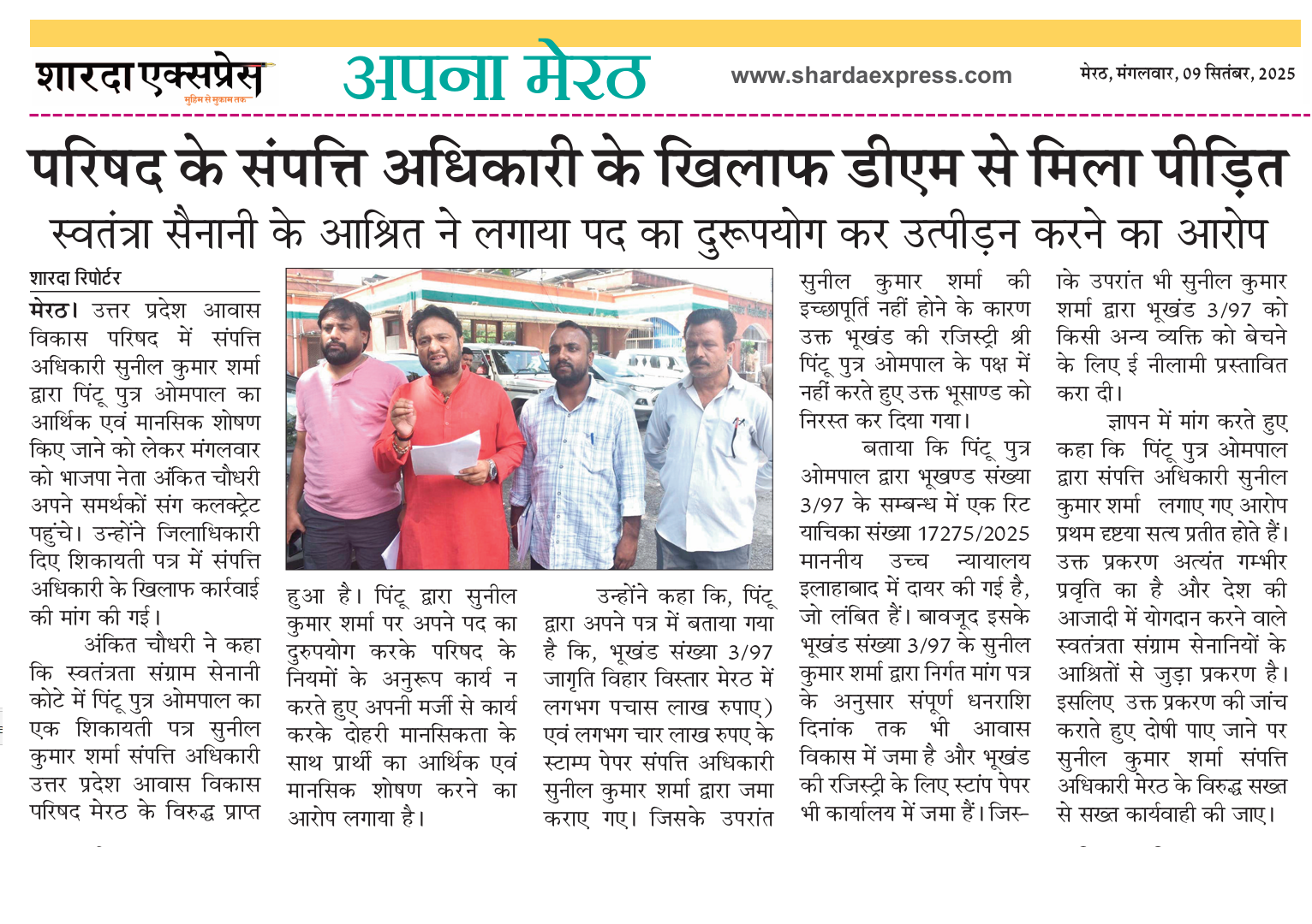 अंकित चौधरी ने कहा कि स्वतंत्रता संग्राम सेनानी कोटे में पिंटू पुत्र ओमपाल का एक शिकायती पत्र सुनील कुमार शर्मा संपत्ति अधिकारी उत्तर प्रदेश आवास विकास परिषद मेरठ के विरुद्ध प्राप्त हुआ है। पिंटू द्वारा सुनील कुमार शर्मा पर अपने पद का दुरुपयोग करके परिषद के नियमों के अनुरूप कार्य न करते हुए अपनी मर्जी से कार्य करके दोहरी मानसिकता के साथ प्रार्थी का आर्थिक एवं मानसिक शोषण करने का आरोप लगाया है।